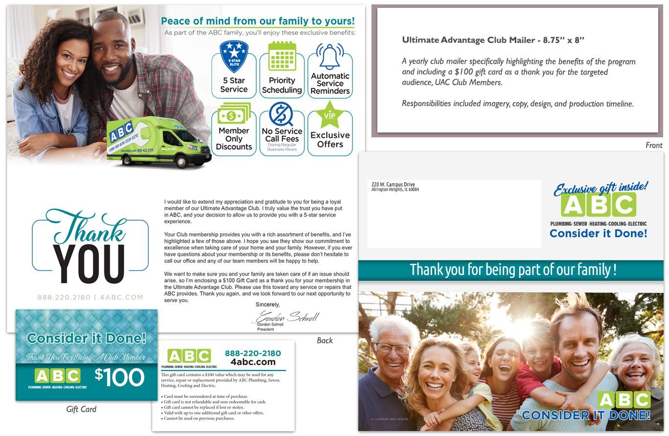 Promotional mailer sent out to members of the Ultimate Advantage Club, a folder color envelope with gift card.